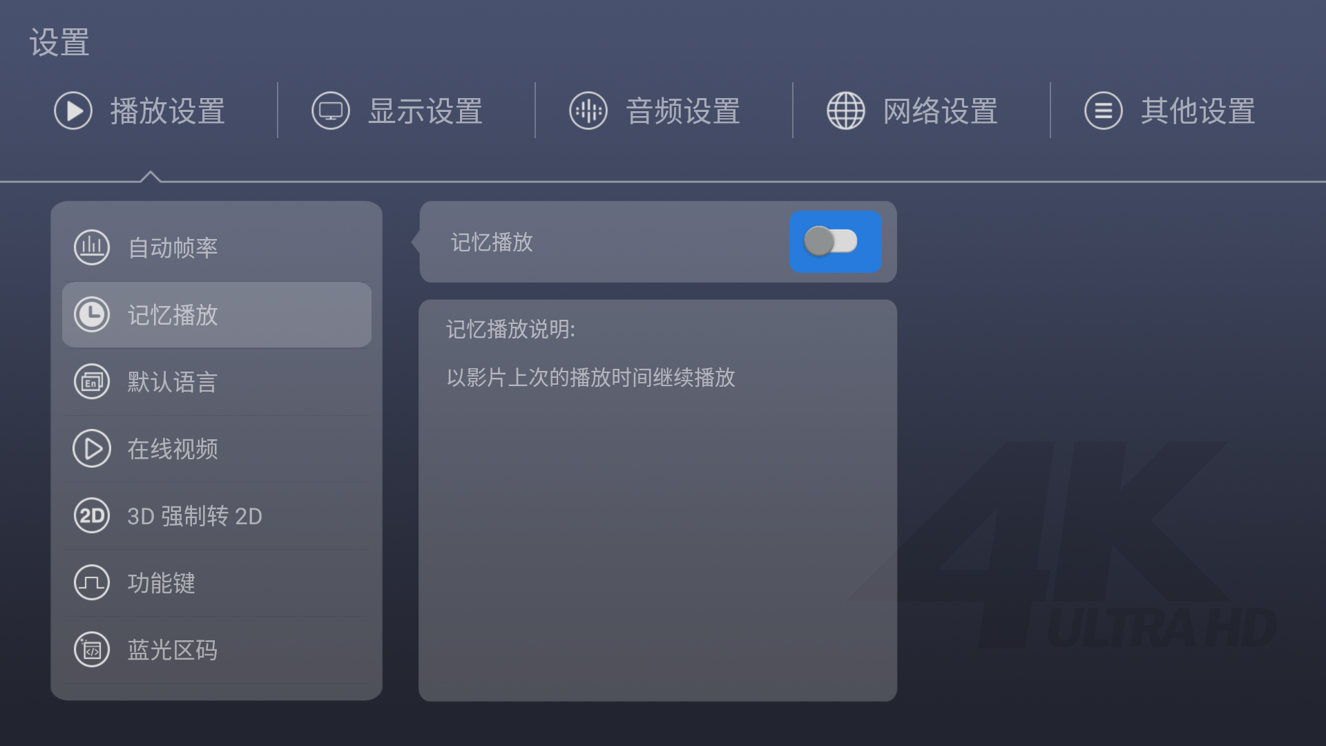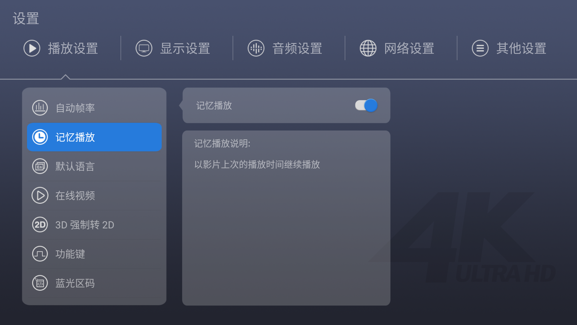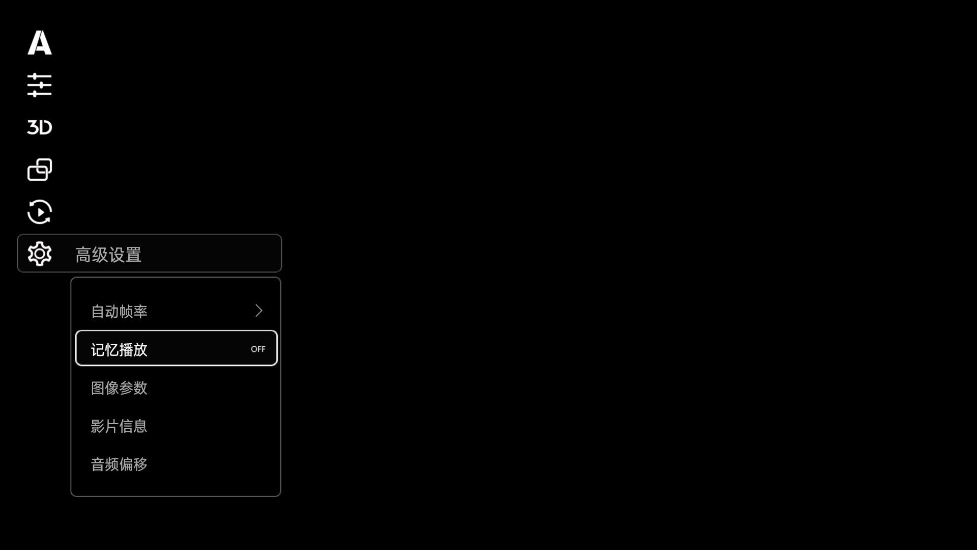 2、也可在影片中按遥控器菜单键-----高级设置----记忆播放中打开