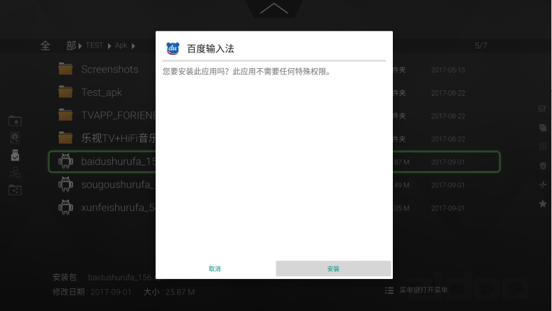 一:下载百度输入法(百度一下即可),存放在U盘,接入盒子,打开盒子文件管理器,找到安装包,点击安装