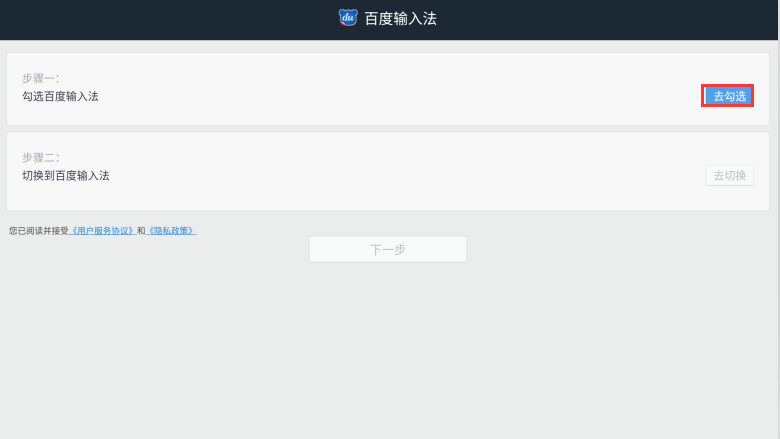 二:打开百度输入法,根据提示,勾选百度输入法,点击 "去勾选"