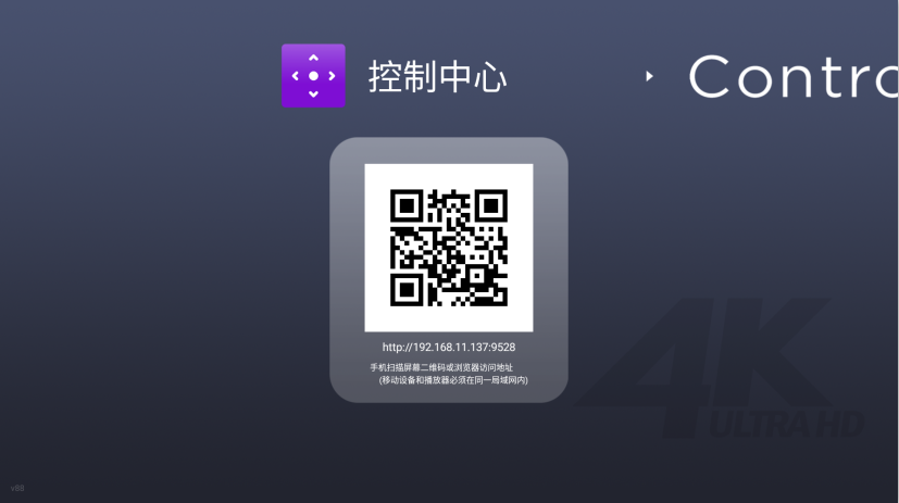 2.手机(微信或浏览器)扫描二维码进入手机控制,也可进入浏览器,输入二维码下方地址(电脑同)进入控制中心,注意手机或者电脑必须与播放器在同一局域网内;