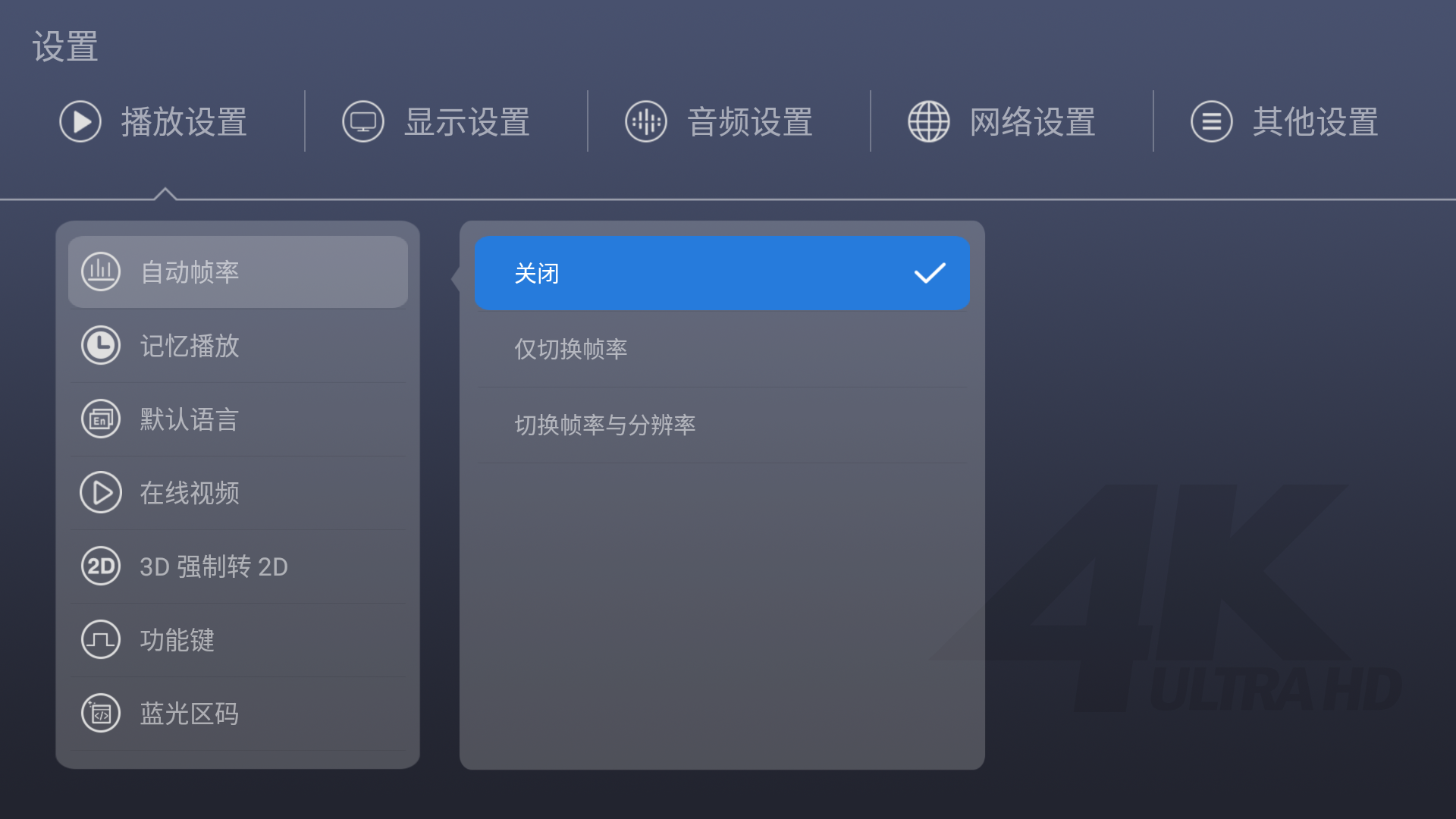 1、进入快捷设置,选择播放设置----自动帧率----关闭