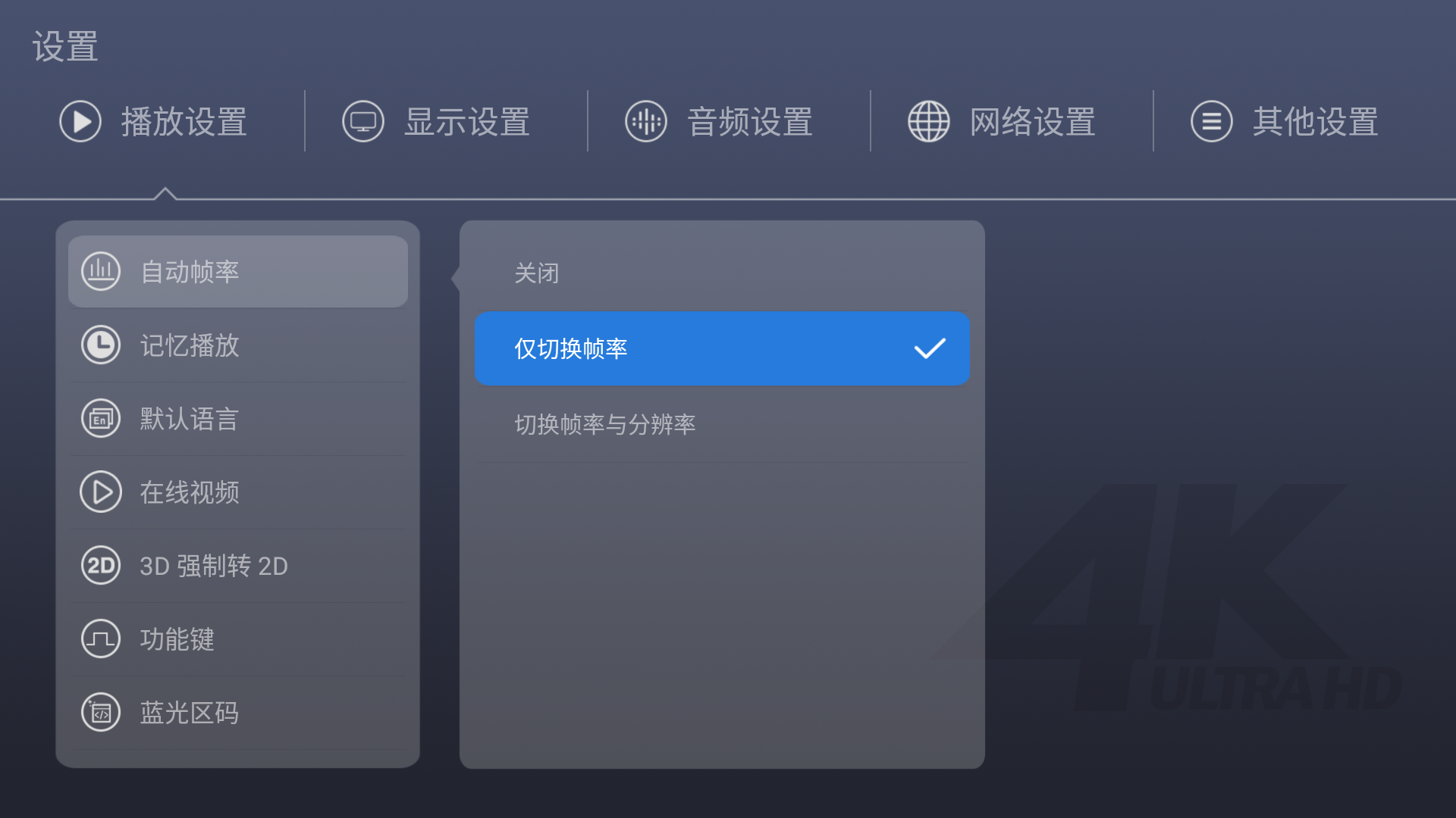 3、进入快捷设置,选择播放设置----自动帧率----仅切换自动帧率