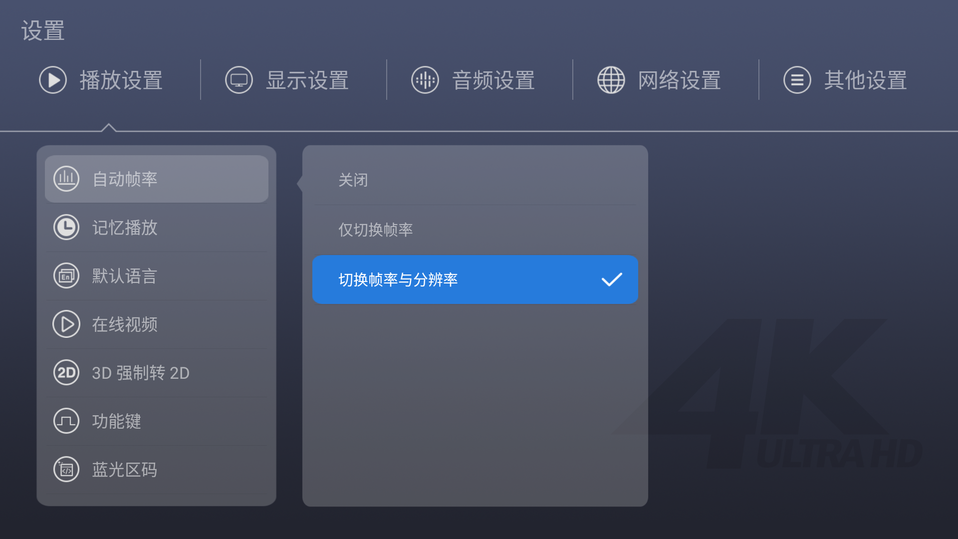 6、进入快捷设置,选择播放设置----自动帧率----切换帧率与分辨率