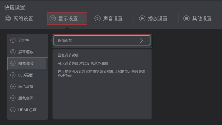 一:进入快捷设置选中:显示设置→图像调节→OK键打开 图像调节