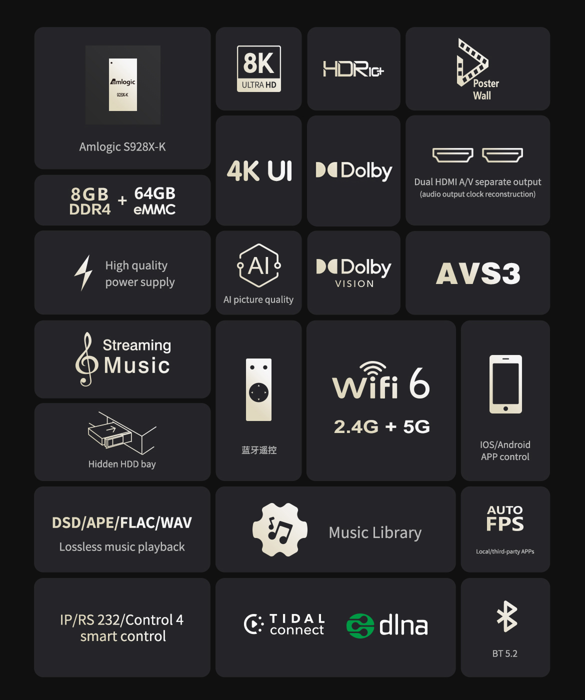 *Supports AV1/VP9/H.265/AVS3/AVS2 video codecs, 12-bit, BT.2020 wide color range; supports Atmos audio pass-through output.