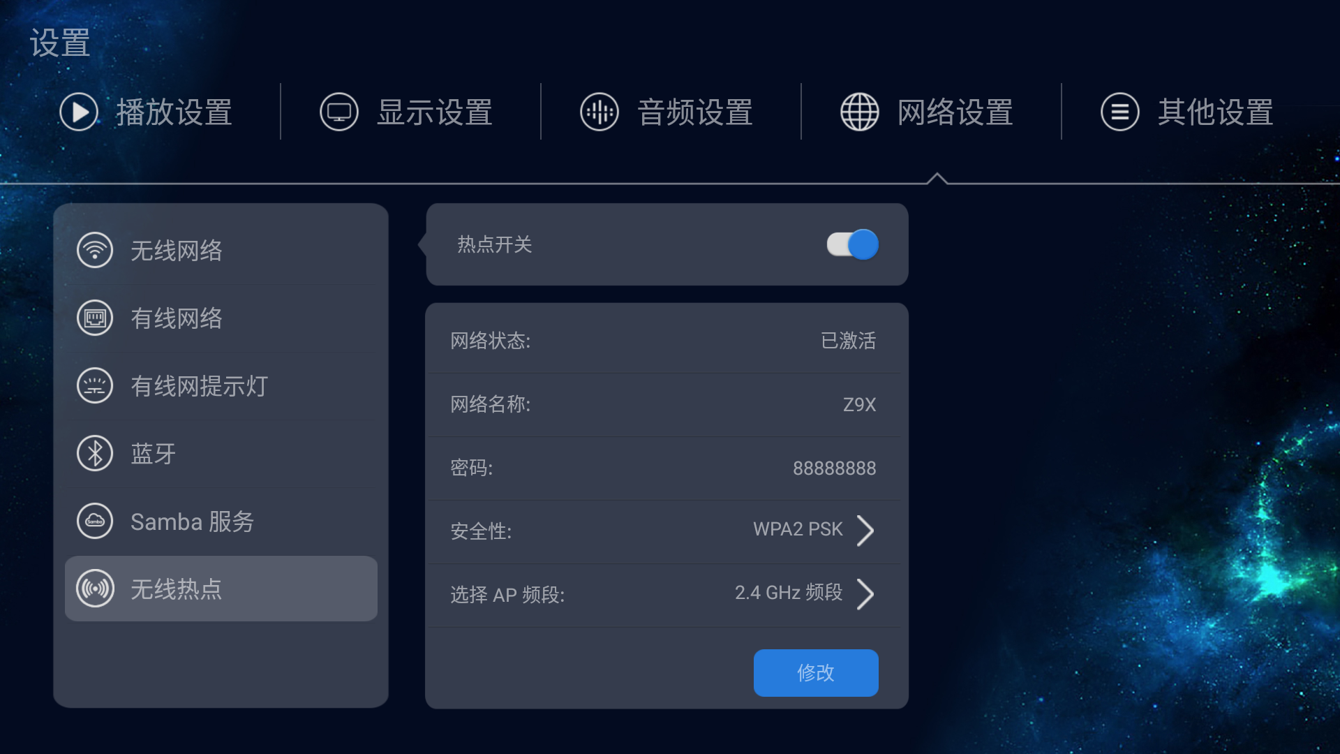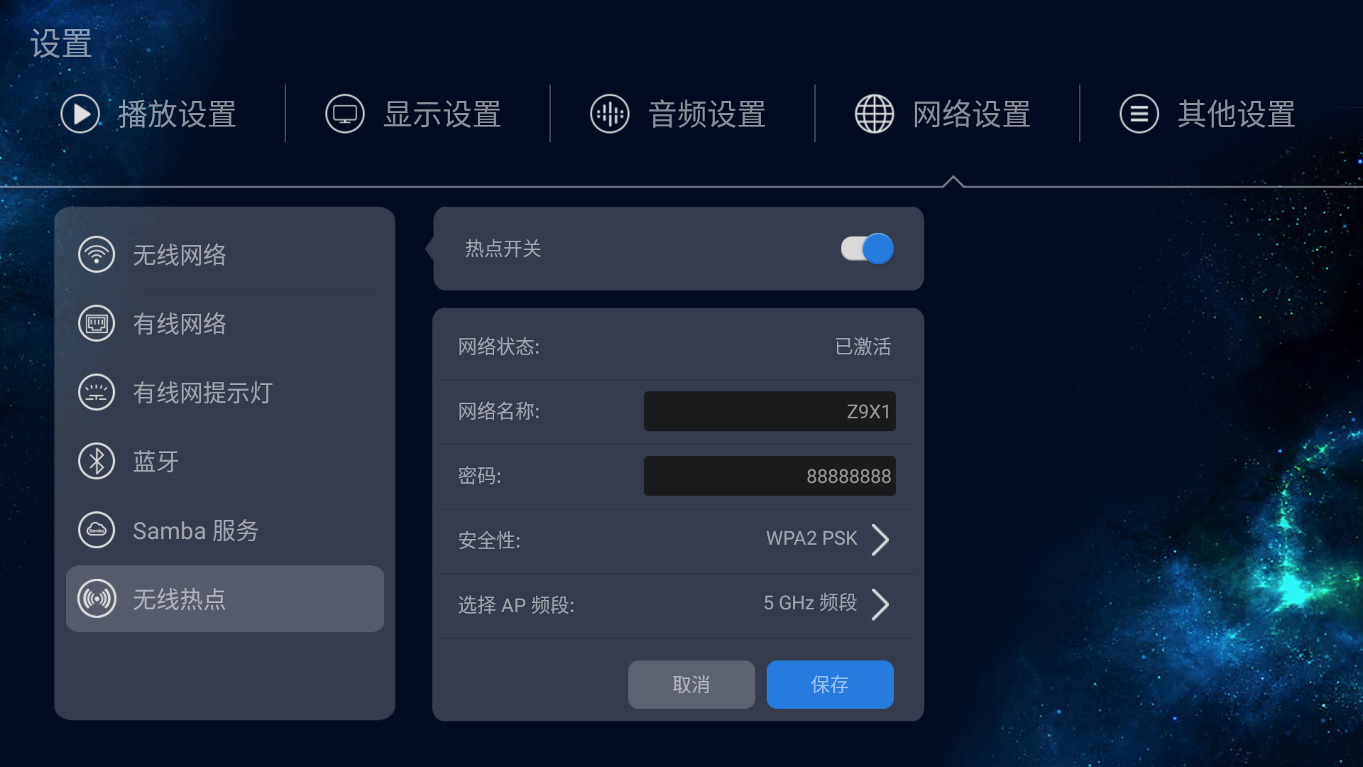 WiFi热点功能指芝杜播放器插入网线正常联网状态下,通过无线网卡发送WiFi信号让其他WiFi设备连接使用,实现网络共享。